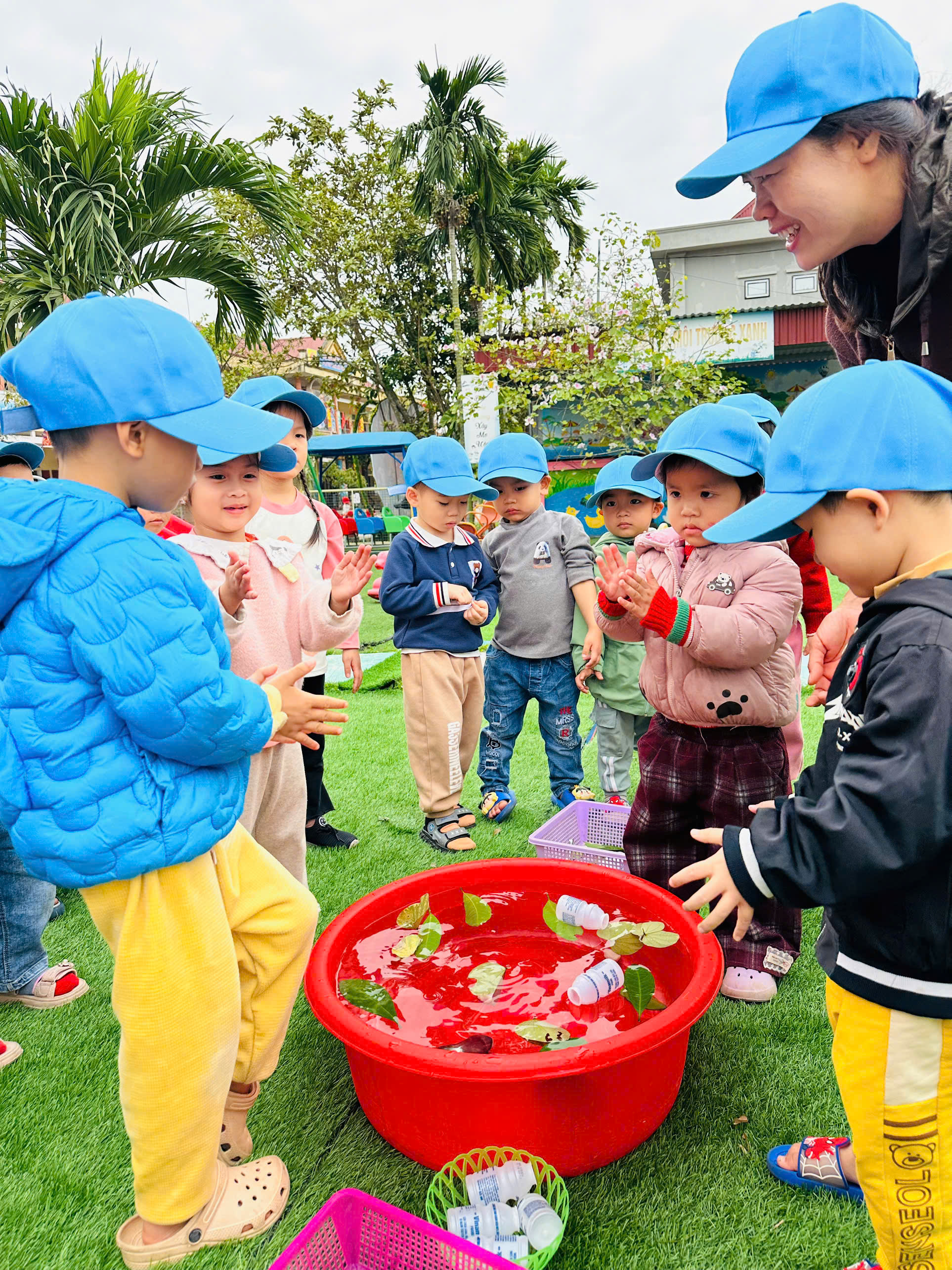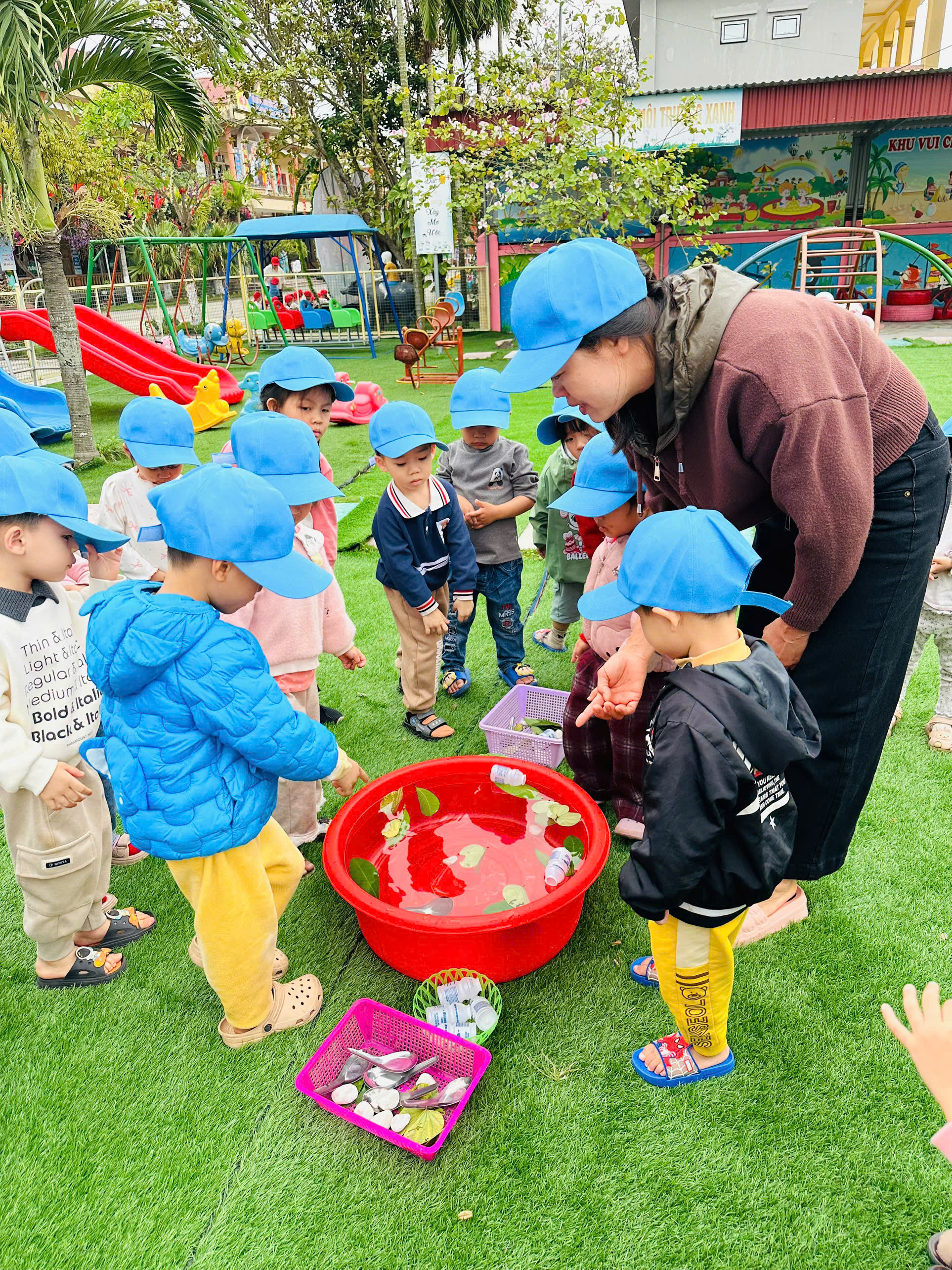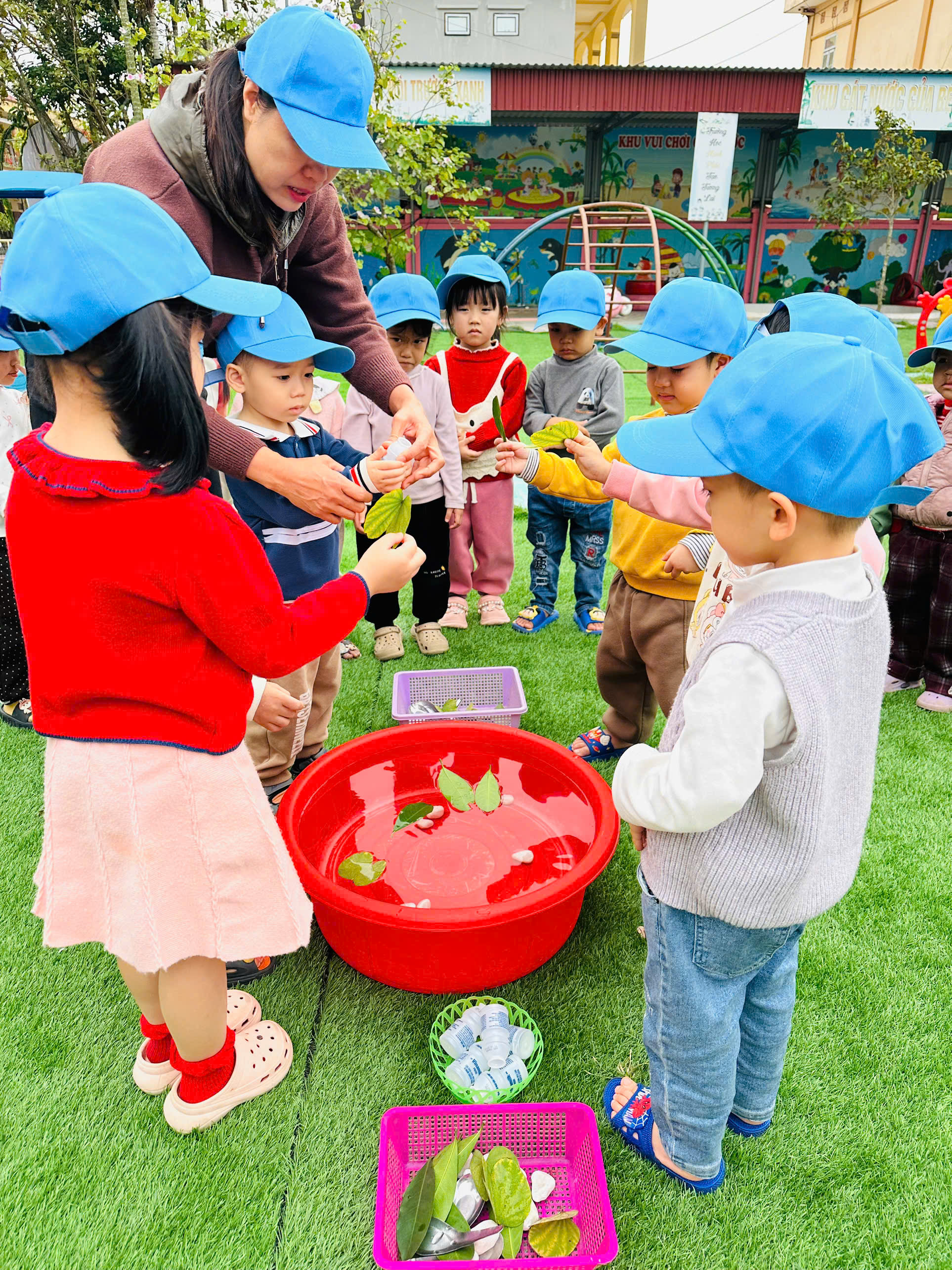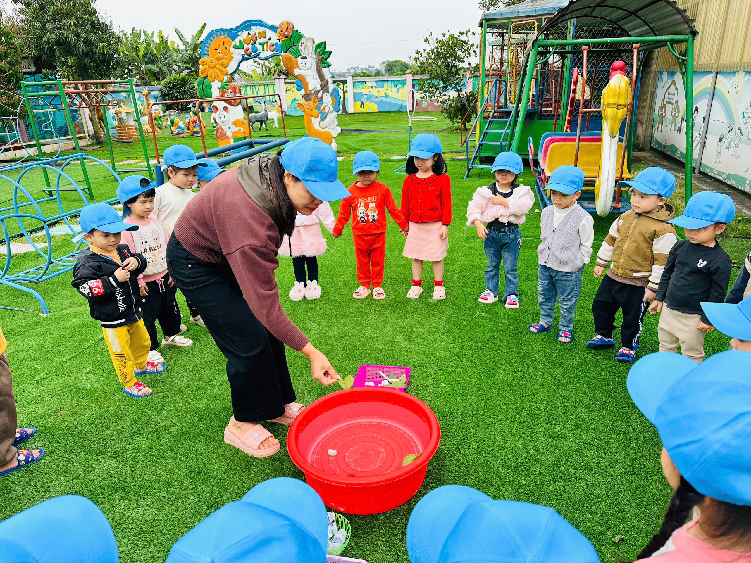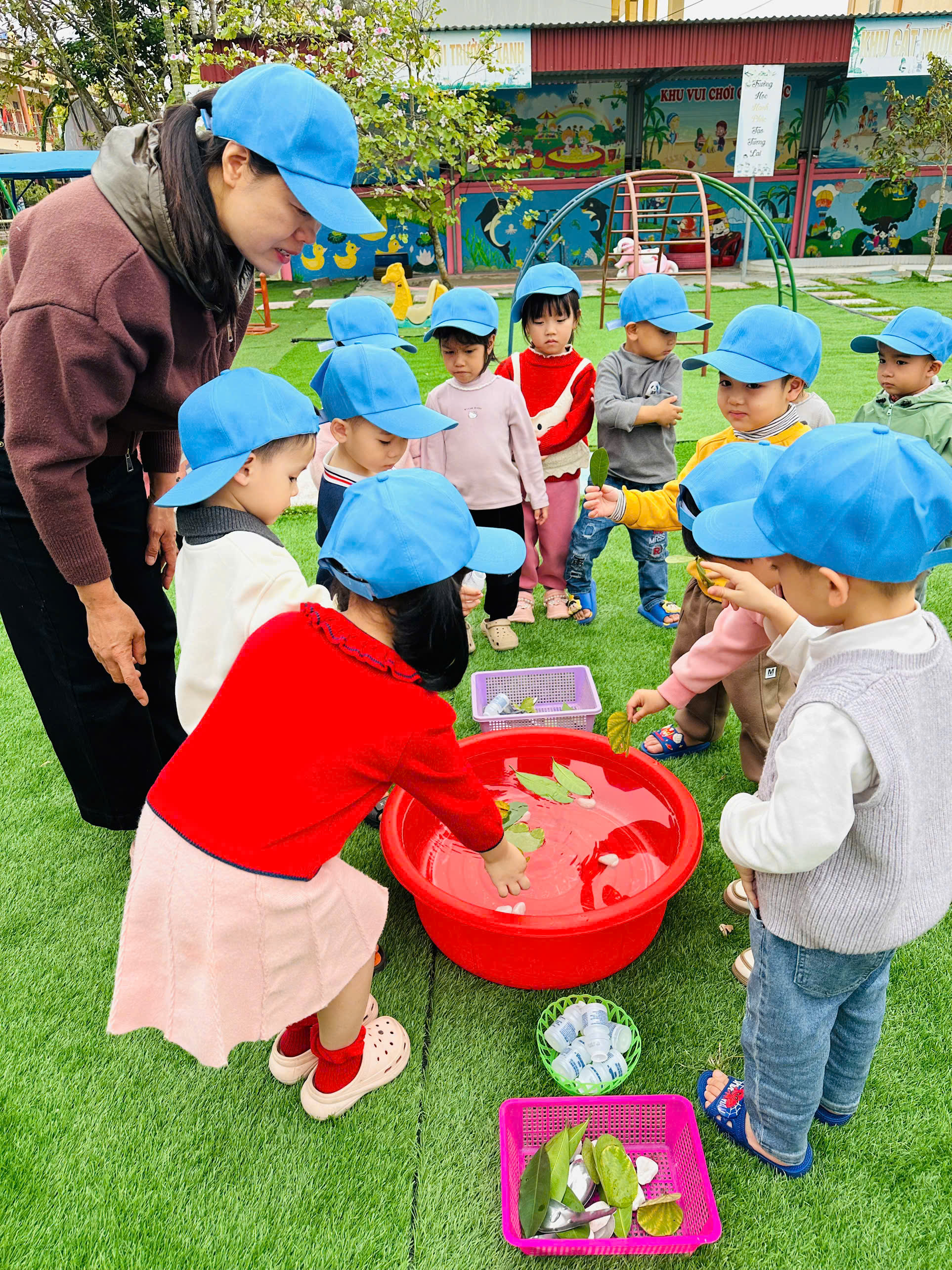 Lớp 3 Tuổi A Trường MN Nghĩa Lạc đã có một buổi hoạt động ngoài trời vô cùng thú vị với nhiều trò chơi bổ ích. Một trong những hoạt động nổi bật là quan sát vật chìm, vật nổi. Các bé được thả những vật dụng khác nhau như hòn đá, vỏ chai, lá cây vào một chậu đựng nước và quan sát xem vật nào nổi, vật nào chìm. Qua đó, trẻ không chỉ học được sự khác biệt giữa các vật thể mà còn rèn luyện khả năng quan sát và tư duy khoa học.