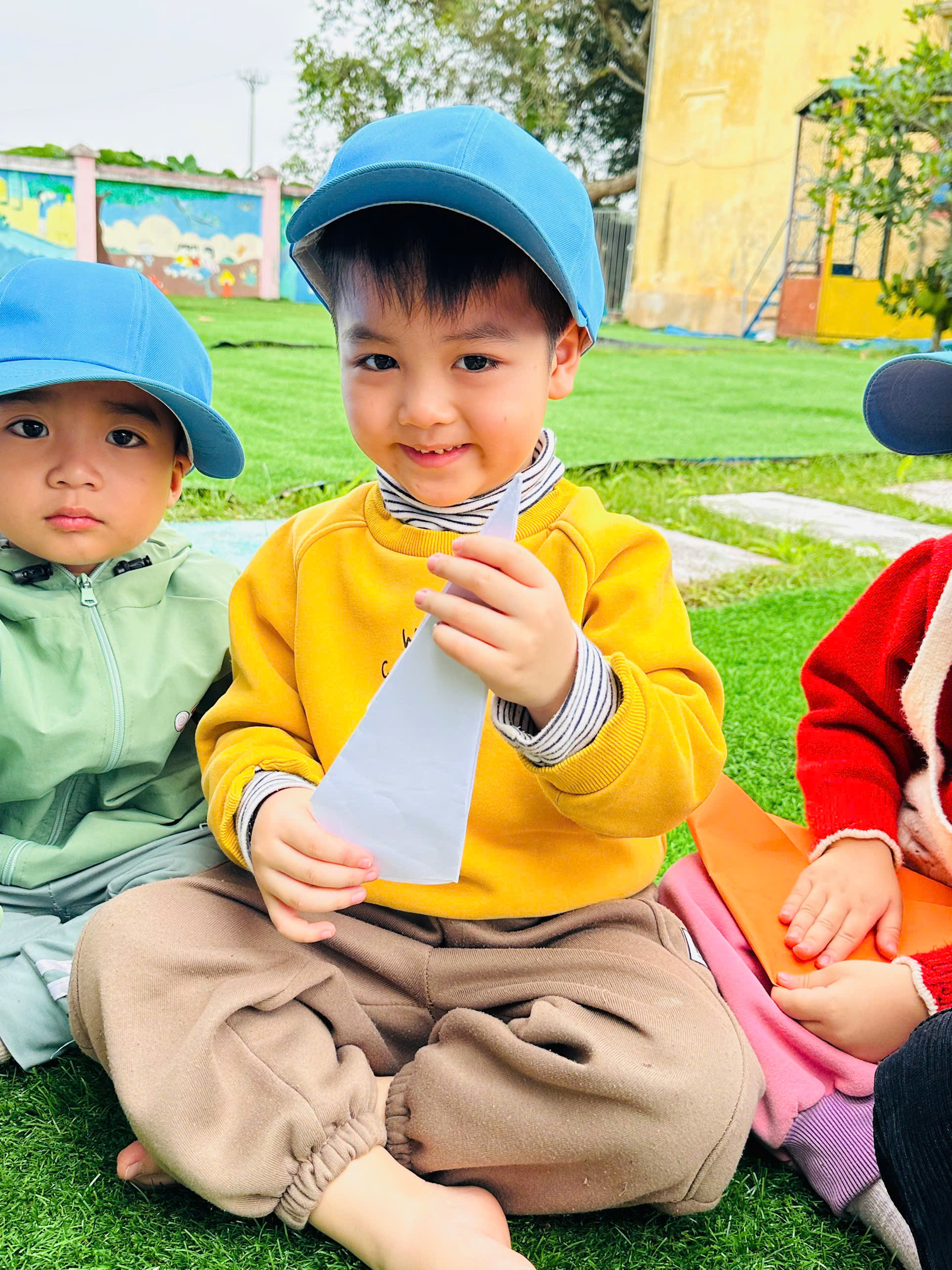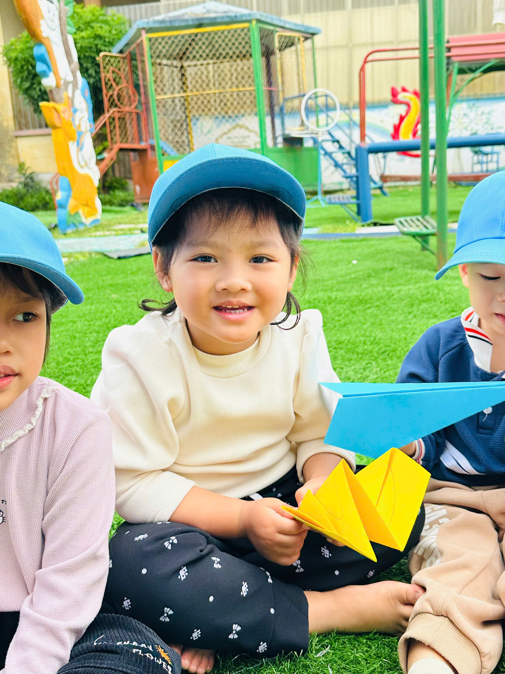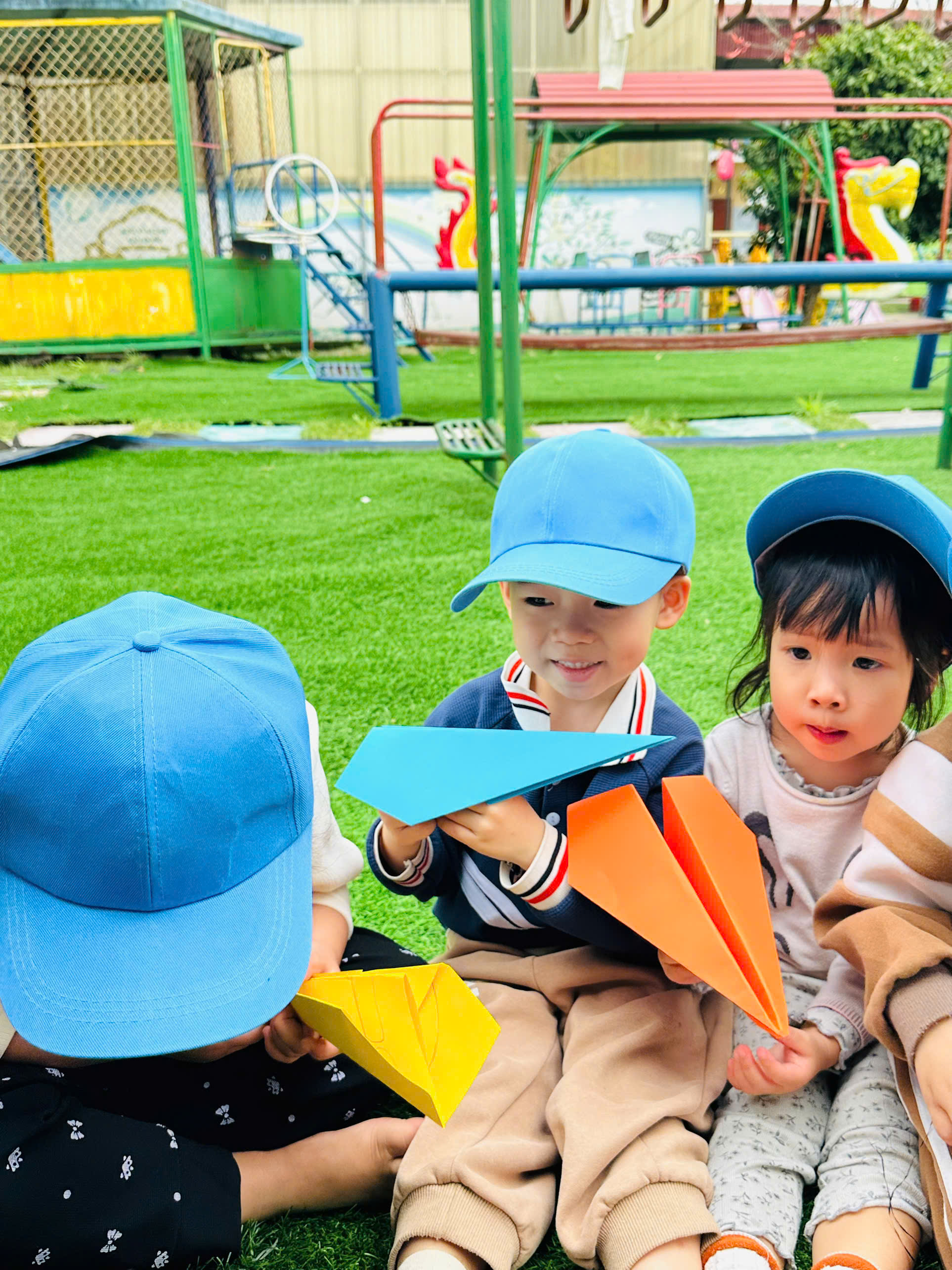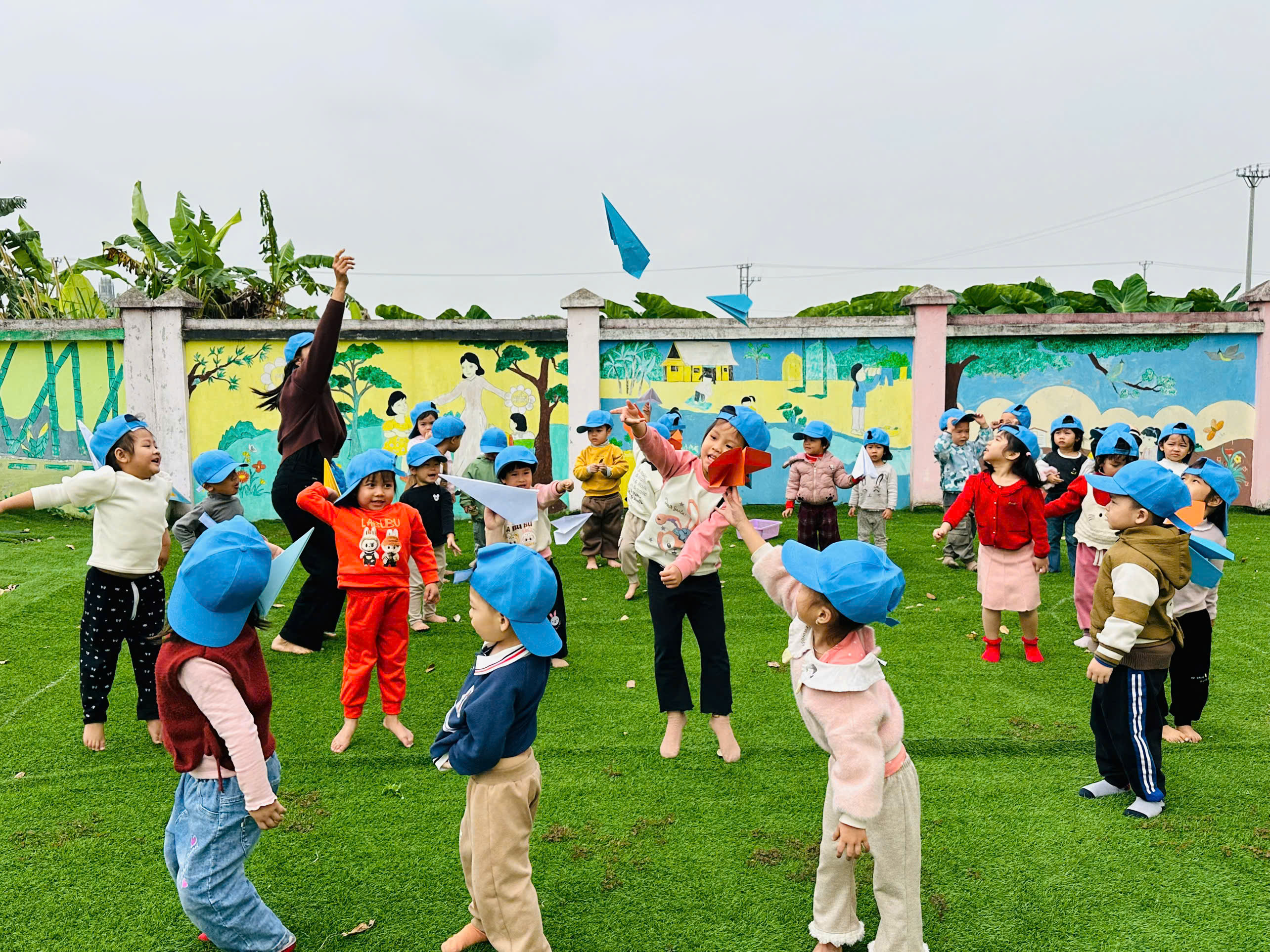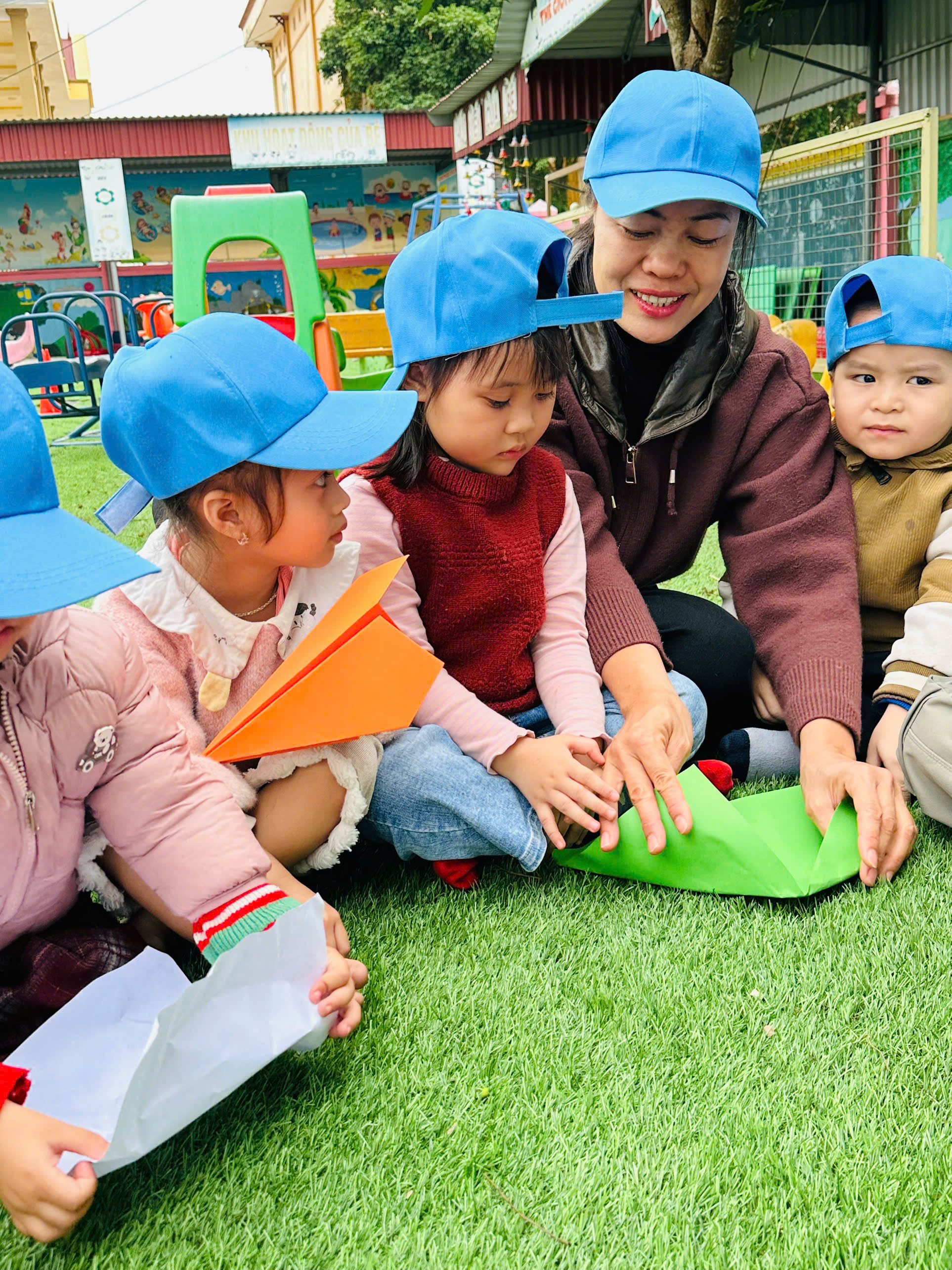 Bên cạnh đó, các bé còn được tham gia trò chơi gấp và thả máy bay giấy. Dưới sự hướng dẫn của cô giáo, các bé cùng nhau gấp những chiếc máy bay xinh xắn từ giấy màu. Sau khi hoàn thành, các bạn nhỏ vô cùng thích thú khi được chạy và thả máy bay của mình bay lên cao. Hoạt động không chỉ giúp trẻ rèn luyện sự khéo léo của đôi tay mà còn mang lại niềm vui và tiếng cười sôi nổi cho cả lớp.